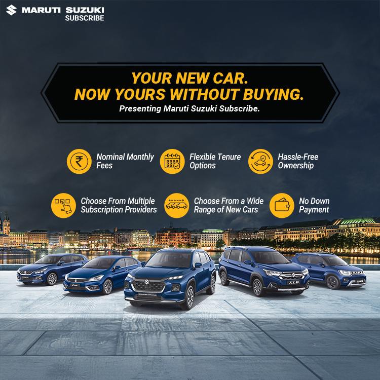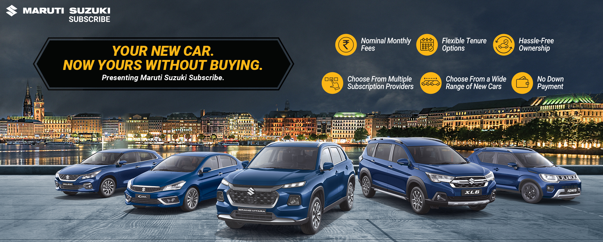 Maruti Suzuki Subscribe enables all customers to enjoy driving their preferred Maruti Suzuki cars without having to deal with all the financial responsibilities that come with owning a car.All you need to do is opt for a monthly subscription plan at a fixed monthly fee, which includes the routine maintenance and insurance costs, and choose a flexible tenure. At Kiran Motors in, , Bhavnagar, all Hatchback, Sedan, SUV, the MUV models line-up includes Baleno, Invicto, EVitara, Jimny, Ciaz, Ignis, Fronx, Grand Vitara, XL6. Here, you will enjoy Maruti Suzuki Subscribe benefits such as: